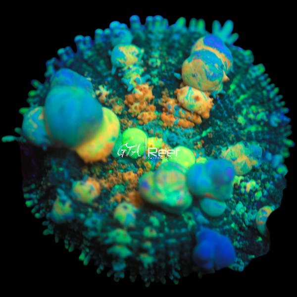 The Halloween Bounce Mushroom is an electrifying member of the Rhodactis family, prized for its bold coloration and explosive texture. With a dense, bubbly surface covered in inflated vesicles ("powerballs"), this coral glows with a mix of neon green, deep purple, and intense orange or red, depending on lighting conditions. Under actinic or blue LEDs, the Powerball Mushroom lights up like a miniature firework, making it a standout in any reef aquarium.