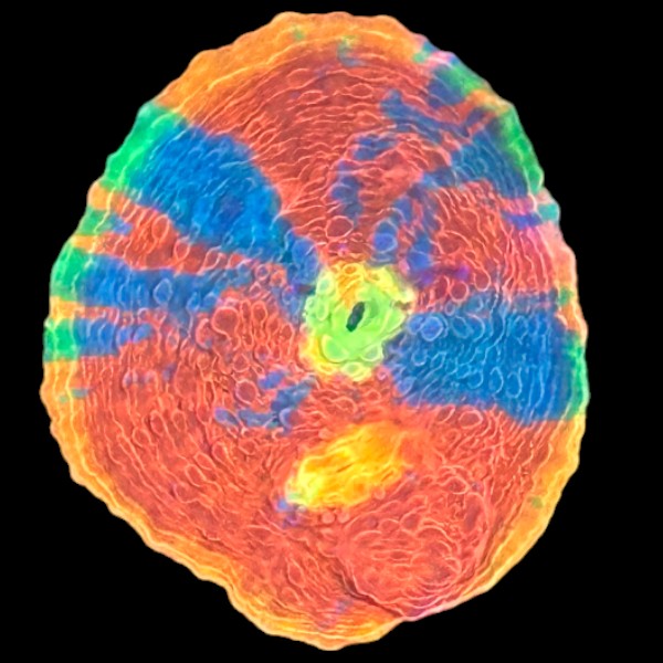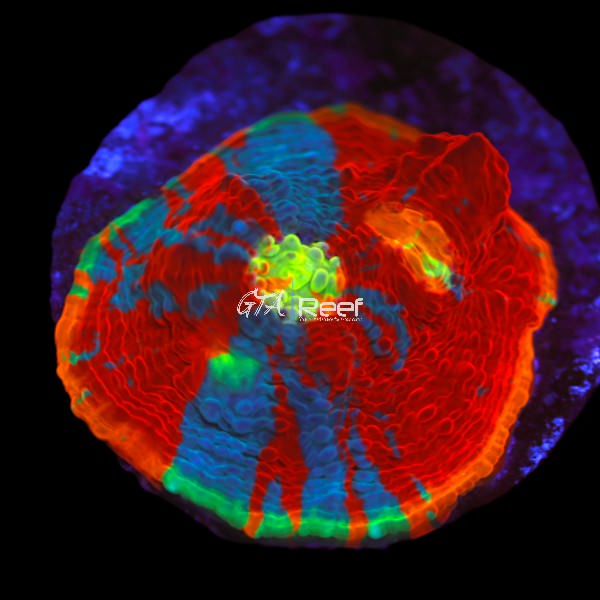 The OG RR Rainbow Dynamite Chalice is the legendary original strain that put this coral on the map. Renowned for its explosive rainbow coloration, this chalice displays glowing reds, neon greens, and electric purples layered across its ridged surface. Under actinic lighting, the OG lineage truly pops, making it one of the most collectible chalice corals in the reefing hobby.