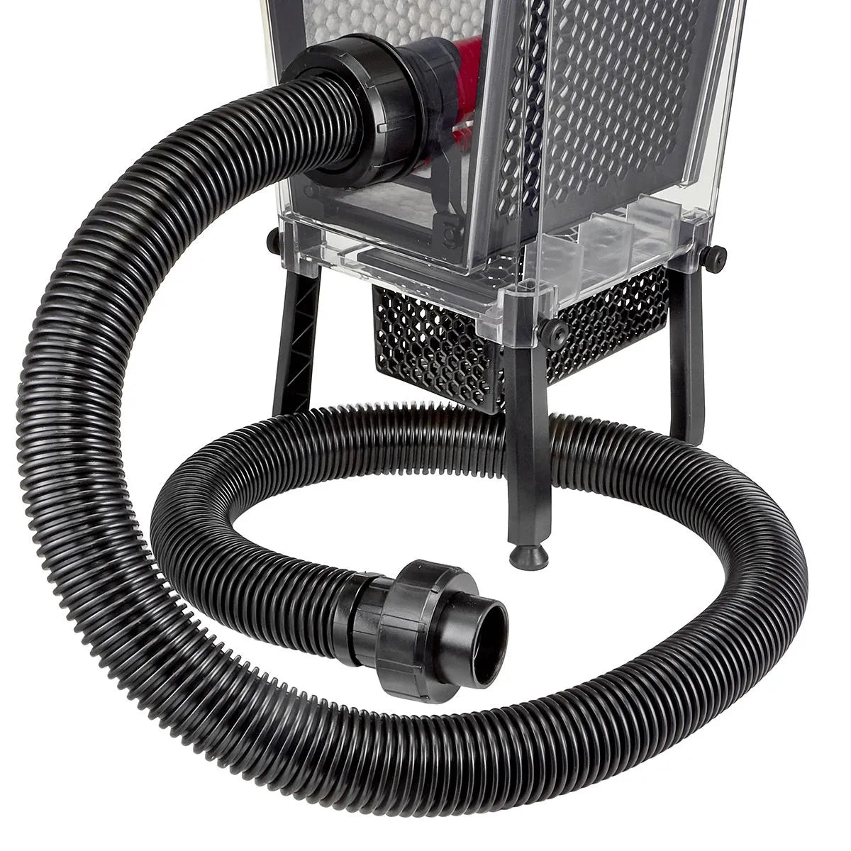 Kink-resistant, corrugated (32mm/1.25" ID) inlet hose with a PVC universal connector (suitable for both metric and USA piping) is provided to easily connect the ReefMat directly to the aquarium downpipe or dedicated feed pump.