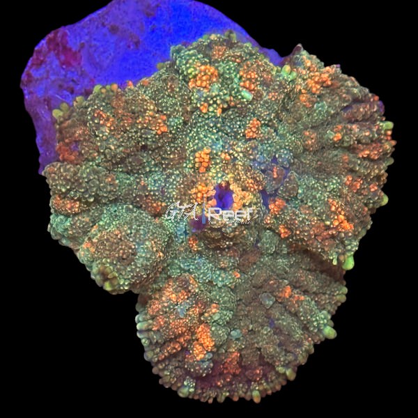 The Starfire Rhodactis is a show-stopping mushroom coral that radiates cosmic energy and fiery brilliance. With its intense mix of glowing orange, radiant red, ultraviolet blues, and neon green fringe, this coral truly lives up to its stellar name. Under actinic lighting, the Starfire Rhodactis ignites with vivid fluorescence, resembling a burning star in the deep ocean sky.